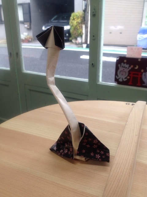 以前行った企画展「妖怪食堂〜雛祭〜」のフライヤーを使った妖怪折紙のろくろ首です!