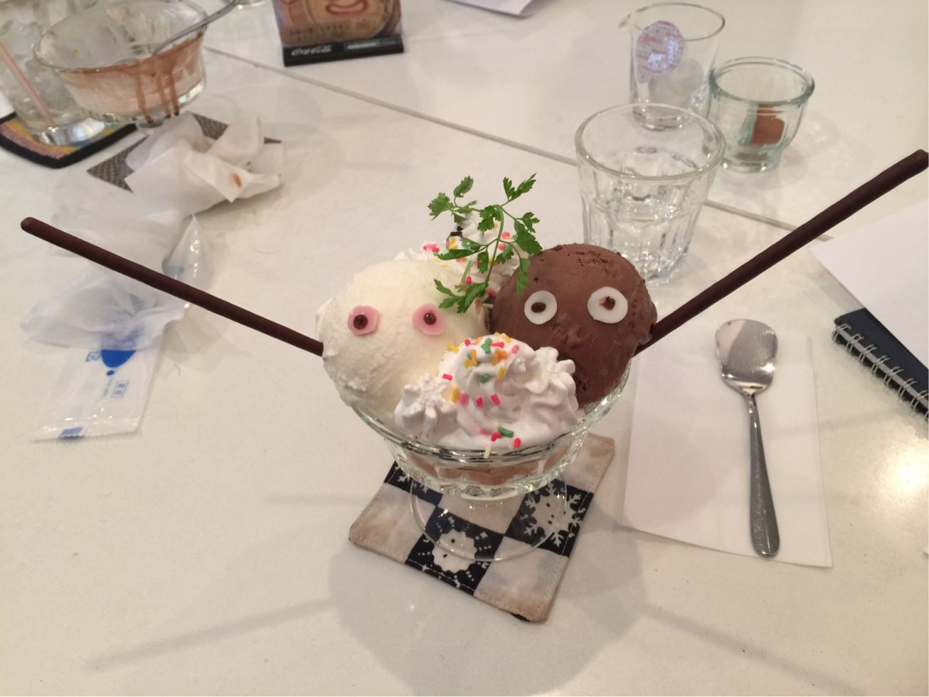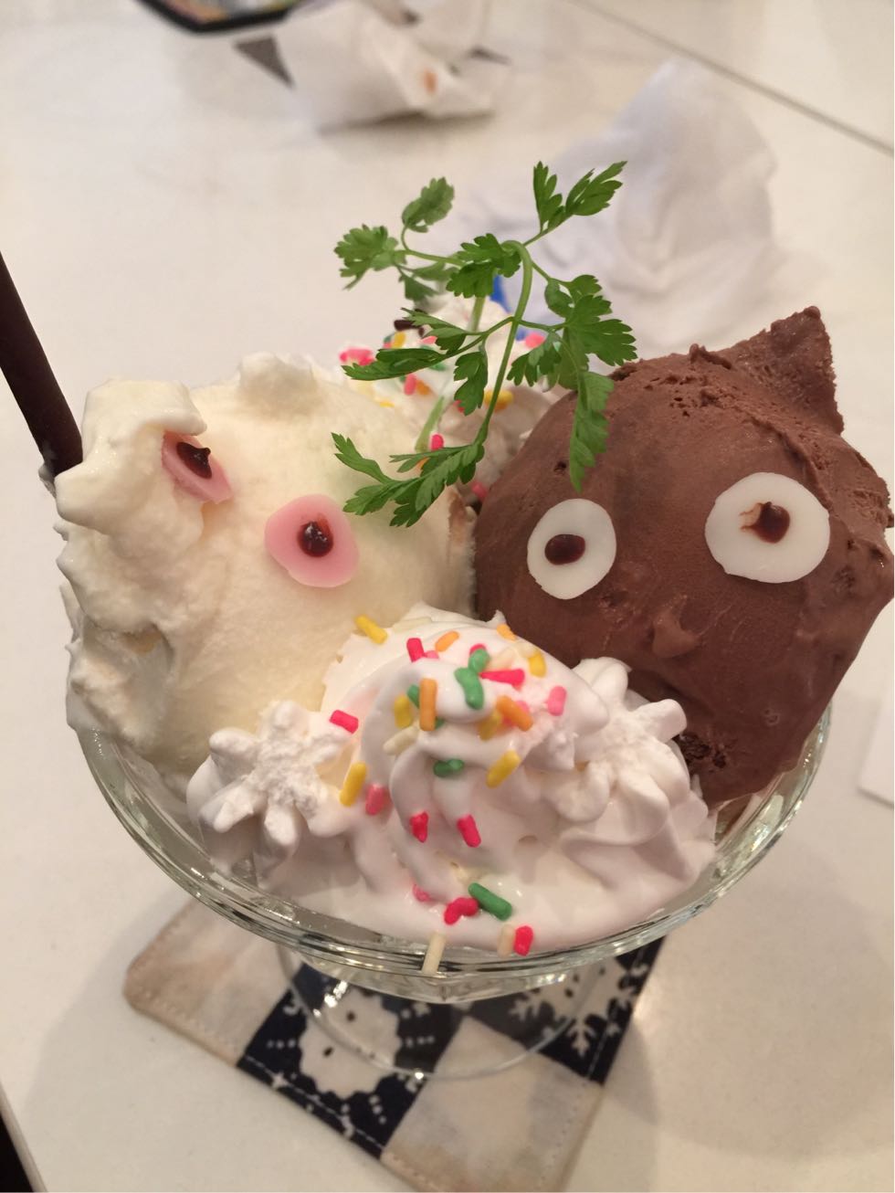 白坊主と黒坊主という妖怪いるんですけど、それぞれ白坊主をバニラアイス。黒坊主をチョコレートアイスに見立てて、セルフィーユを柳の木に見立ててって感じのパフェです。